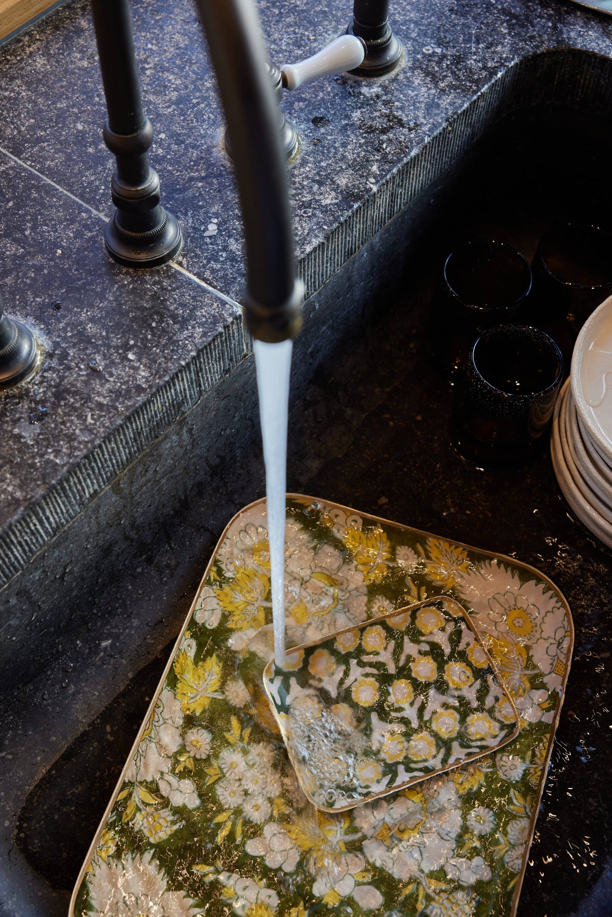 Plateau conçu en métal émaillé avec un bord doré à la main. C'est une pièce unique, façonnée par les mains d'artisans, ce qui lui confère ses irrégularités. Dos uni. Ne passe pas au lave-vaisselle ni au micro-ondes. Laver avec une éponge humide.